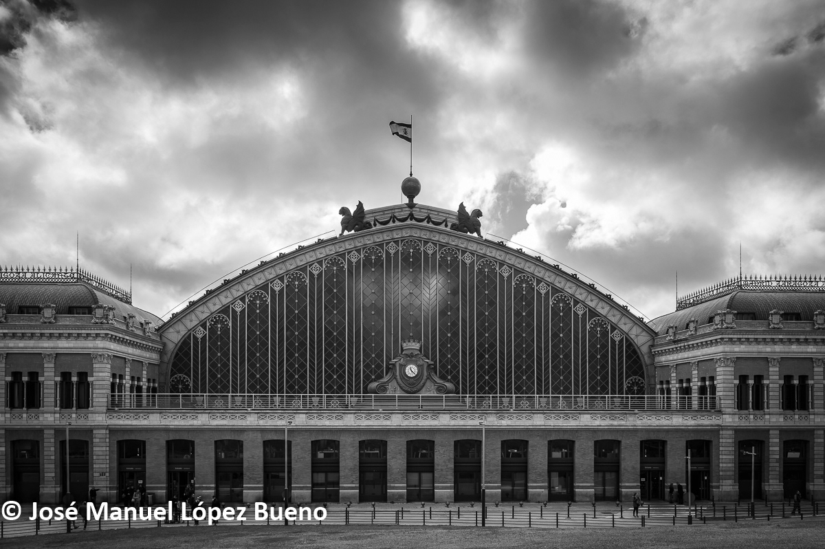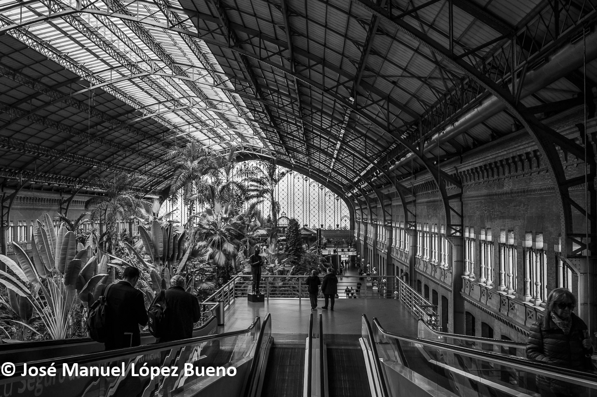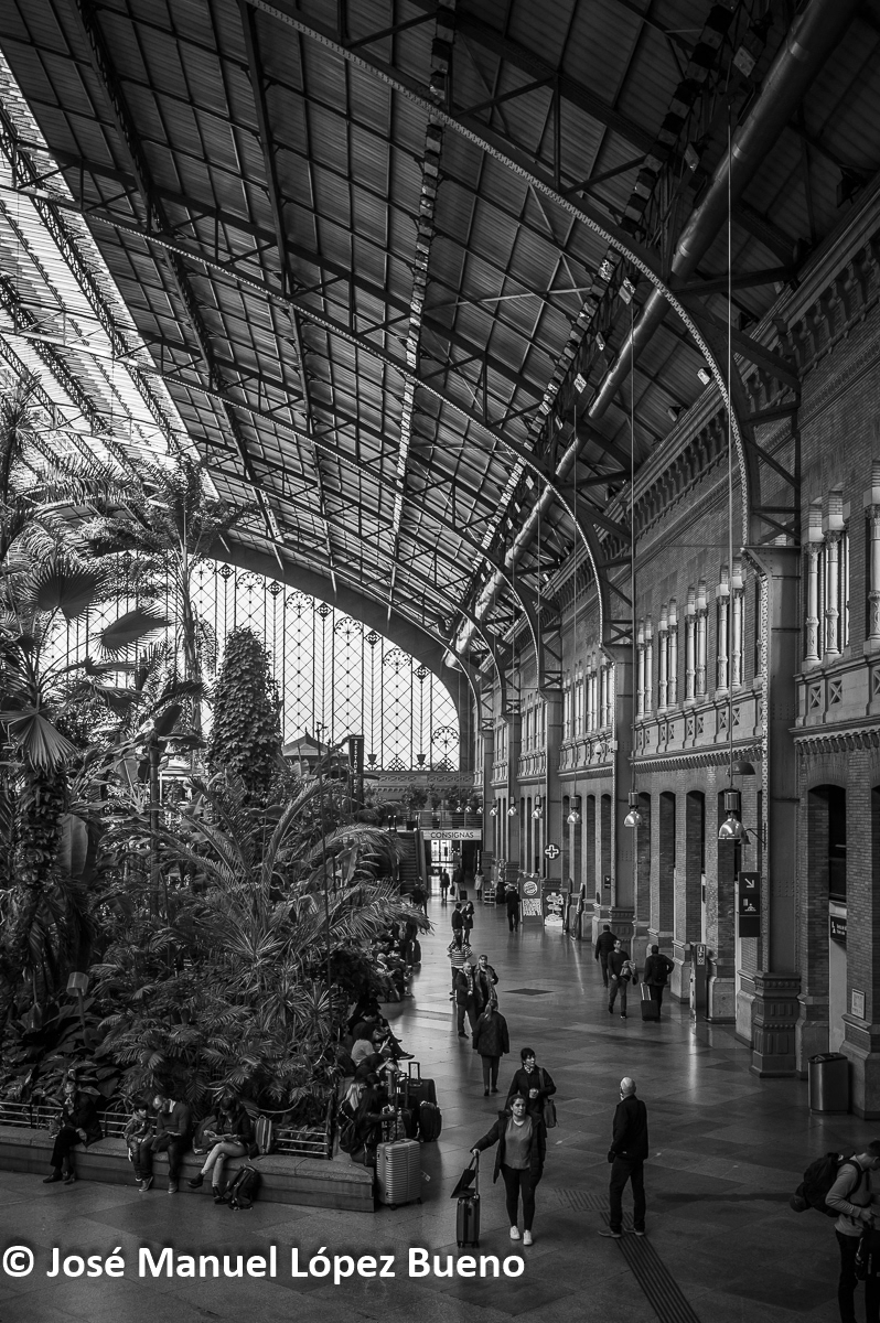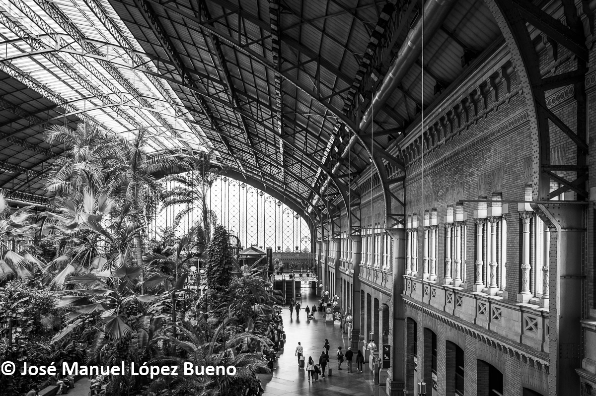 En la Estación de Atocha, los espacios centenarios se entrelazan con la memoria de los viajeros que cruzan sus pasillos. La luz que entra por los altos ventanales dibuja sombras sobre el hierro y la piedra, mientras los ecos del pasado y del presente convergen en un mismo instante. Esta serie en blanco y negro reduce la escena a forma, textura y silencio, invitando a una mirada que reflexiona sobre el tránsito, la llegada y la partida, sobre el papel de Atocha como cruce de caminos y punto de encuentro en la ciudad de Madrid.